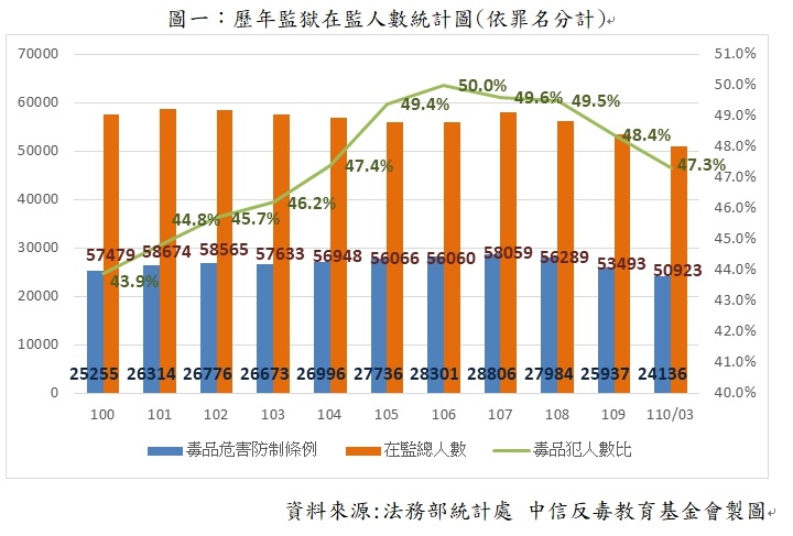 從『肅清煙毒條例』時期,毒品相關犯罪者一直都是監獄裡的多數,也形成獄所負荷量的極大負擔,且基於吸毒犯罪者本身的複雜需求性,監禁隔離往往不是解決問題的好方法。所以有一群調查官及立委共同爭取毒品案件應適用於刑事訴訟中的緩起訴處分制度,並在民國97年法務部正式修正『毒品危害防制條例』24條,讓毒品犯的緩起訴處分正式取得法律基礎,且考量吸食毒品者的戒癮需求,增加『附命完成戒癮治療』,讓毒品使用者的醫療需求再次被看重。但因為實務現場,戒癮醫療專業並不普遍,並不是所有縣市都具備足夠專業的戒癮醫療團隊,但因應法律規範而必須配合,反而形成部分縣市的戒癮治療流程僅是配合檢察官所設計的流程,而並非全面考量戒癮者的需求,導致戒癮治療的品質有嚴重的城鄉差距。另一方面,民國97年擬定的『毒品戒癮治療實施辦法及完成治療認定標準』第2條,將戒癮治療的範圍限定為施用第一級毒品,卻反而讓吸食較低危害的二級毒品使用者,沒有獲得緩起訴處分及戒癮治療的機會,且在母法『毒品危害防制條例』條文中並未限縮緩起訴處分適用的毒品類型。為了讓立法者及醫療界看見二級毒品使用者也適用於緩起訴處分,當時在松德院區任職的束醫師與台北地檢署合作試辦二級毒品緩起訴戒癮治療計畫,當時的研究顯示緩起訴處分對於二級毒癮者是具有效益的,也促成民國107年修訂標準,將二級毒品正式納入緩起訴處分範圍。從歷年監獄在監人數統計來看,雖然毒品犯人數仍占據在監總人數接近一半比例,但從107年開始人數比例有出現了下滑的趨勢,顯示將二級毒品納入緩起訴處分範圍,確實稍有緩解在監人數毒品犯高比例的問題(詳見圖一)。